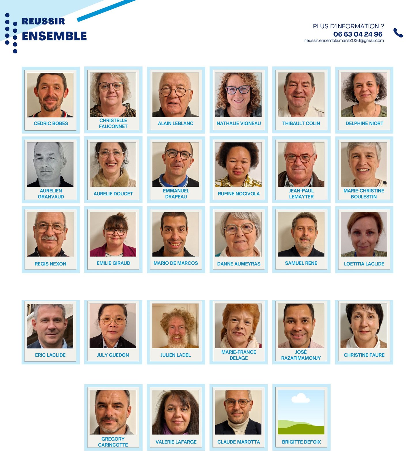 “REUSSIR ENSEMBLE” c’est 29 personnes investies et animées par le désir de travailler avec humanité et rigueur. Pour rétablir la confiance entre élus et administrés mais également entre élus et agents territoriaux.